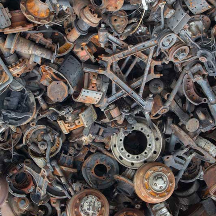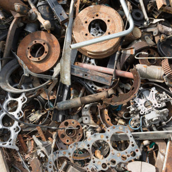 Scrap auto parts are processed to recover valuable metals such as steel, aluminum, and copper.